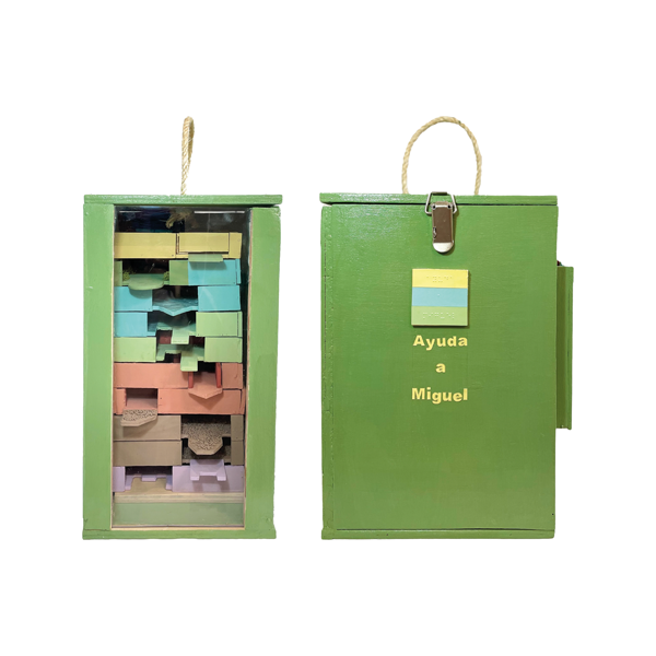 Ayuda a Miguel es el primer prototipo de la serie: un cuento a piezas que el lector va uniendo conforme avanza en su aventura, con soporte visual (texto en negro, tipografía Arial 14), táctil (tarjetas en braille) y sonoro (audiocuento). Posee esa característica común de los cuentos para estas edades: la moraleja, la enseñanza de valores.